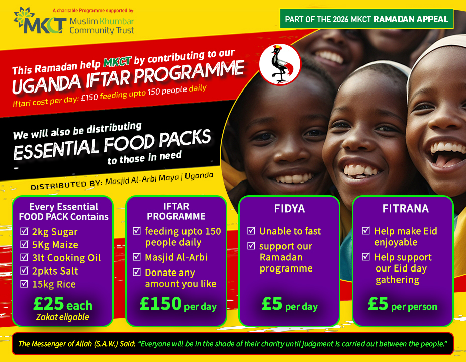 Online Banking to: Account Name: Muslim Khumbar Community Trust Sort-code: 40-45-08 Account Number: 52005395 Ref. for Iftar Program: UGX IFTAR 24 OR Ref. for Food Packs: UGX PACKS 24
